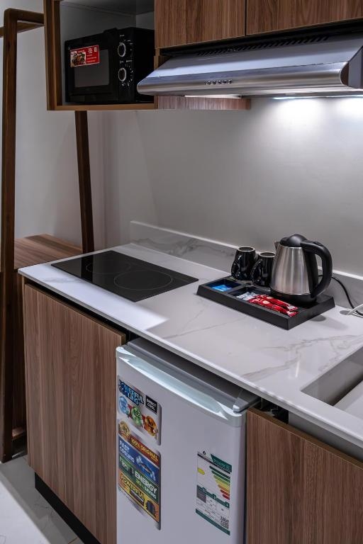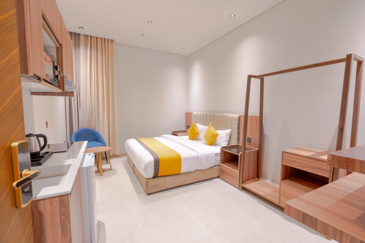 Each room includes a dining table, microwave, shower, slippers, TV, and electric kettle. Essential Facilities: Guests can enjoy a bar and a 24-hour front desk. Free on-site parking is available, and the hotel provides a welcoming environment for all visitors.